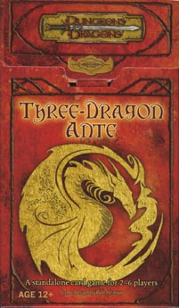 Walk into a Tavern... ...to gather a little information, plan their next dungeon foray - and kick back with a game of THREE-DRAGON ANTE. Crack open this box and experience the high-stakes game of chance preferred by DUNGEONS & DRAGONS characters of all classes and levels. Play THREE-DRAGON ANTE as a standalone card game when you don't have time for a full-fledged D&D adventure. Or play it as part of your roleplaying campaign - where your character's abilities can give you a unique winning edge! THREE-DRAGON ANTE is a fast-paced noncollectable card game for two to six players. To play, you'll need chips, coins, or some other way to represent each player's hoard of 50 gold pieces. Contains 72 cards and rulebook. www.wizards.com/dnd |