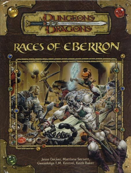 Item Code: #17745 Title: Races of Eberron Type: Accessory Author: Jesse Decker, Matthew Sernett, Gwedolyn F.M. Kestrel, Keith Baker Published: 2005 Format: 192-page perfect-bound hardback book w/business reply mail insert and 20-page novel preview insert |