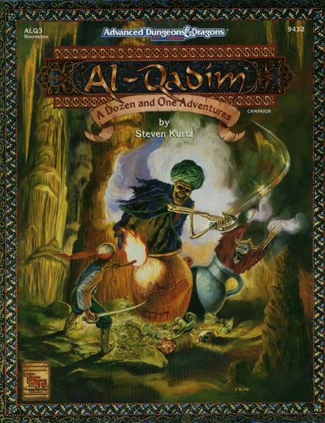 Throughout the Land of Fate! There is no escaping Fate in the world of Zakhara, home of caliphs and favored land of the genies. And the Fate of brave adventurers is to travel the wide realms, vanquishing the unrighteous and protecting the meek. A Dozen and One Adventures leads the characters from bustling Muluk, City of Kings, to the mysterious citadel of flame, and many points between. They may meet the king who never died, the fish-people of the Great Sea, and other wonder too amazing to mention. This adventure sourcebox contains a 64-page booklet of 13 adventures, a 32-page campaign guide describing Muluk, the northern lands, and several new magical items, a poster map of Muluk and Krak al-Niraan, six map cards, and four MC insert pages featuring NPCs. |