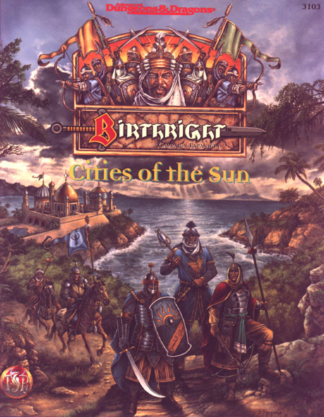 As far as one could see, ships closed menacingly, and warriors swarmed across enemy decks. Smoke tinted red by the dying sun shrouded the misty sea. The attacking seamen raised an unholy clamor, and the stench of flaming pitch stung the eye. Through it all, el-Arrasi stood proudly at the helm. When his vessel drew alongside the Anuirean flagship, he was first to leap to the enemy decks, sword drawn. In the fight that followed, none could stand against his relentless onslaught. And as the sun slipped beneath the waves, he palced his scimitar at the admiral’s throat and forced his yield. El-Arrasi had at last defeated the Anuirean Empire’s great armada, breaking the Iron Throne’s power over his people. -Historian Boran el-Dussein, in Victories of el-Arrasi Ever since throwing off the yoke of Anuirean rule centuries ago, the land of Khinasi - the Sun Coast of Cerilia - has been a land of promise for bold adventurers. Here the sea means life, the city-state means power, and the working of true magic is the most honorable profession of all. The remnants of the ancient Masetian civilization keep watch over the new culture grown up in its place. The land’s many monster lords, called awnsheghlien, keep watch too - with a more sinister purpose in mind. This expansion to the Birthright campaign setting contains: