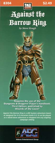 Item Code: #AEG8304 Title: Against the Barrow King Type: Adventure For: 4-6 characters, levels 3-5 Author: Steve Hough Published: 2000 Publisher: Alderac Entertainment Group Format: 16-page book |