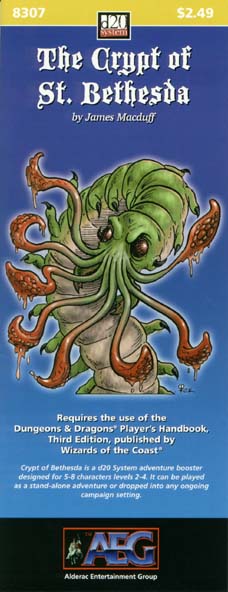 Item Code: #AEG8307 Title: The Crypt of St. Bethesda Type: Adventure For: 5-8 characters, levels 2-4 Author: James Macduff Published: 2000 Publisher: Alderac Entertainment Group Format: 16-page book |