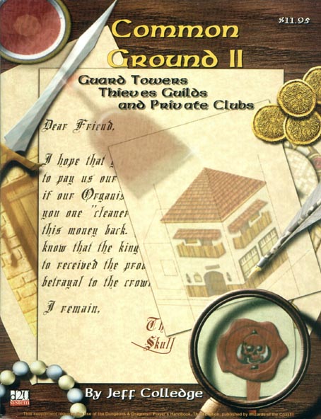 Item Code: #BPR10002 Title: Common Ground II: Guard Towers, Thieves Guilds and Private Clubs Type: Accessory Author: Jeff Colledge Published: 2002 Publisher: Bard's Productions Format: 48-page book |