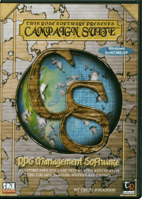 Item Code: #TR10001 Title: Campaign Suite: RPG Management Software Type: Accessory Author: Chris Johanson Published: 2003 Publisher: Twin Rose Software Format: CD-ROM in DVD case |