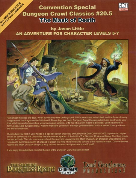 Item Code: #GMG50205 Title: Dungeon Crawl Classics #20.5: The Mask of Death Type: Adventure For: 5th - 7th level characters Author: Jason Little Published: 2005 Publisher: Goodman Games Format: 24-page book |