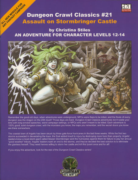 Item Code: #GMG5020 Title: Dungeon Crawl Classics #21: Assault on Stormbringer Castle Type: Adventure For: 12th - 14th level characters Author: Christina Stiles Published: 2005 Publisher: Goodman Games Format: 32-page book |
