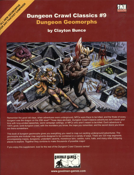Item Code: #GMG5008 Title: Dungeon Crawl Classics #9: Dungeon Geomorphs Type: Accessory Author: Clayton Bunce Published: 2004 Publisher: Goodman Games Format: 32-page book |