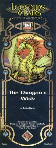 Item Code: #DD08 Title: The Dragon's Wish Type: Adventure For: 4-6 characters, levels 9-12 Author: Justin Bacon Published: 2001 Publisher: Fantasy Flight Games Format: 16-page book |