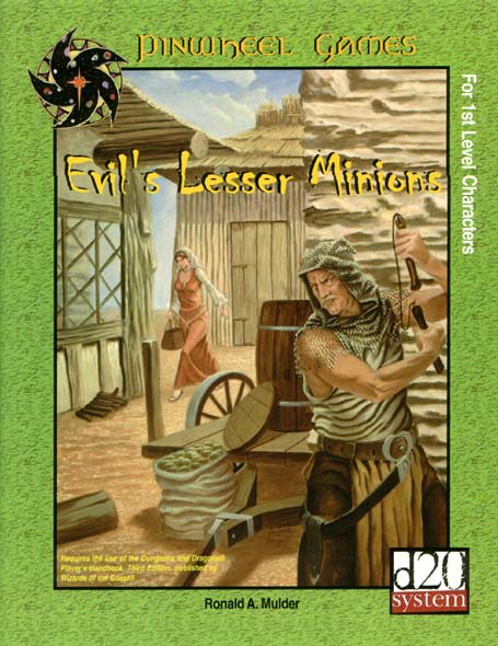 Item Code: #PWG2001 Title: Evil's Lesser Minions Type: Adventure For: 4-6 1st level characters Author: Ronald A. Mulder Published: 2002 Publisher: Pinwheel Games Format: 32-page book |