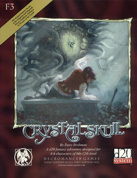 Item Code: #TLGNGF3 (F3) Title: Crystal Skull Type: Adventure For: 4 - 6 characters, levels 8 - 12 Author: David Brohman Published: 2005 Publisher: Necromancer Games Format: 128-page perfect-bound book |