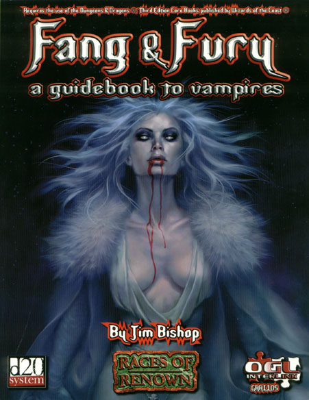 Vampire enemies are a staple of fantasy adventure, but the standard race is too powerful for Player Character use in most d20 campaigns. Fang & Fury: A Guidebook to Vampires presents a new race, the vampire scion, which is balanced for play with conventional PC races. These mysterious creatures have their own history, traditions, and paths to power; and though individuals can come to rival the power of elder vampires, they are always vulnerable to the touch of the sun, or the attack of a holy warrior. Fang & Fury includes: