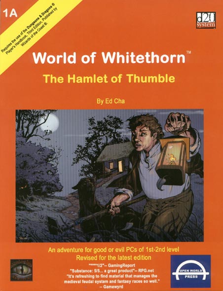 Item Code: #MYG5001 (1A) Title: The Hamlet of Thumble Type: Accessory For: 4-6 characters, levels 1-2 Author: Ed Cha Published: 2003 Publisher: Mystic Eye Games / Open World Press Format: 72-page perfect-bound book |