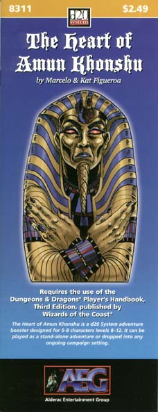 Item Code: #AEG8311 Title: The Heart of Amun Khonshu Type: Adventure For: 5-8 characters, levels 8-12 Author: Marcelo & Kat Figueroa Published: 2001 Publisher: Alderac Entertainment Group Format: 16-page book |