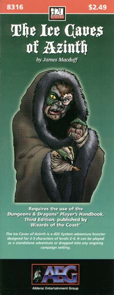 Item Code: #AEG8316 Title: The Ice Caves of Azinth Type: Adventure For: 3-5 characters, levels 2-4 Author: James Macduff Published: 2001 Publisher: Alderac Entertainment Group Format: 16-page book |