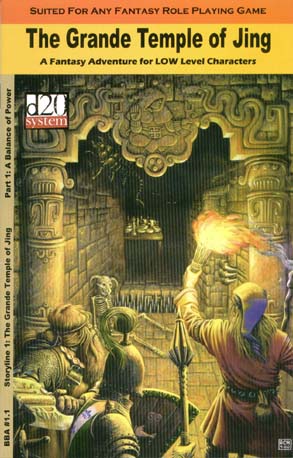 Item Code: #BBA1.1 Title: The Grande Temple of Jing Type: Adventure For: Low level characters Author: Danny O'Neill Published: 2001 Publisher: Hammerdog Games Format: 40-page book |