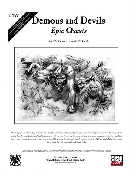 Item Code: (L1W) Title: Demons and Devils: Epic Quests Type: Adventure Author: Clark Peterson and Bill Webb Published: 2001 Publisher: Necromancer Games Format: 21-page PDF file |