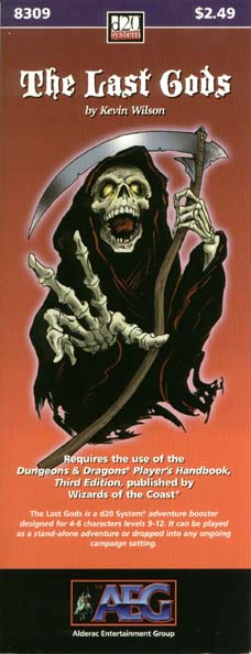 Item Code: #AEG8309 Title: The Last Gods Type: Adventure For: 4-6 characters, levels 9-12 Author: Kevin Wilson Published: 2001 Publisher: Alderac Entertainment Group Format: 16-page book |
