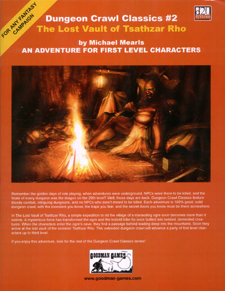 Item Code: #GMG5001 Title: The Lost Vault of Tsathzar Rho Type: Adventure For: 1st level characters Author: Michael Mearls Published: 2003 Publisher: Goodman Games Format: 32-page book |