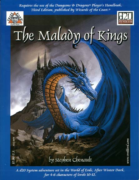 Item Code: #TLG1601 Title: The Malady of Kings Type: Adventure For: 4-6 characters, levels 10-12 Author: Stephen Chenault Published: 2001 Publisher: Troll Lord Games Format: 40-page book |