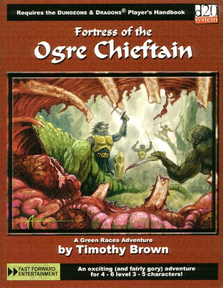 Item Code: #FAF2001 Title: Fortress of the Ogre Chieftain Type: Adventure For: 4-6 characters, levels 3-5 Author: Timothy Brown Published: 2001 Publisher: Fast Forward Entertainment Format: 48-page book |
