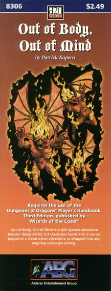 Item Code: #AEG8306 Title: Out of Body, Out of Mind Type: Adventure For: 3-5 characters, levels 4-6 Author: Patrick Kapera Published: 2000 Publisher: Alderac Entertainment Group Format: 16-page book |
