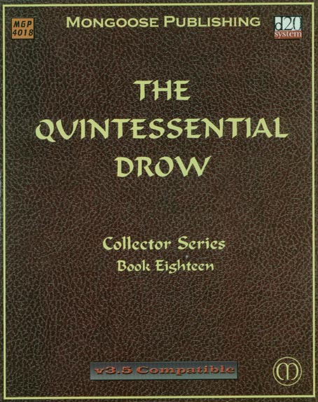 Item Code: #MGP4018 Title: The Quintessential Drow Type: Accessory Author: Sam Witt Published: 2003 Publisher: Mongoose Publishing Format: 128-page perfect-bound book |