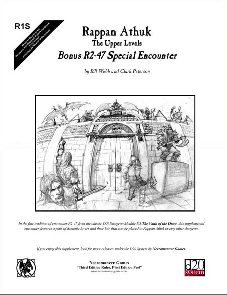 Item Code: (R1S) Title: Rappan Athuk: The Upper Levels: Bonus R2-47 Special Encounter Type: Adventure Author: Bill Webb and Clark Peterson Published: 2001 Publisher: Necromancer Games Format: 6-page PDF file |