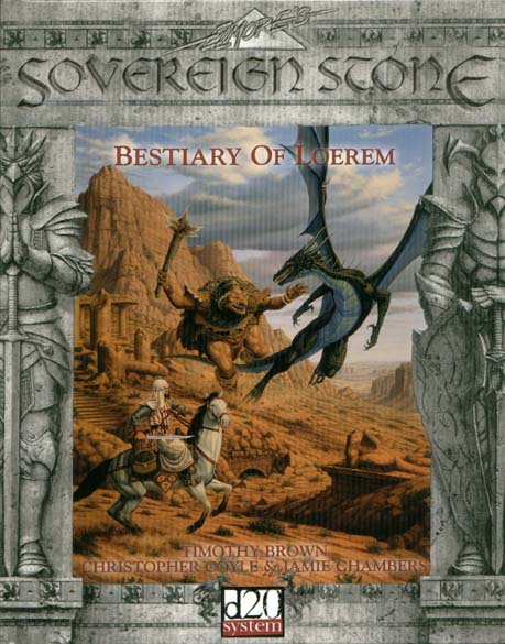 Item Code: #SVP3003 Title: Sovereign Stone: Bestiary of Loerem Type: Accessory Author: Timothy Brown, Christopher Coyle & Jamie Chambers Published: 2002 Publisher: Sovereign Press Format: 224-page perfect-bound hardback book |