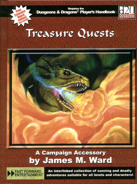 Item Code: #FAF2008 Title: Treasure Quests Type: Adventure Anthology For: 1st level and up Author: James M. Ward Published: 2002 Publisher: Fast Forward Entertainment Format: 160-page enclosed spiral-bound hardback book |