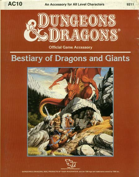 Item Code: #9211 (AC10) Title: Bestiary of Dragons and Giants Type: Accessory Published: 1987 Format: 64-page book, tri-fold perforated cardstock screen, eratta sheet |