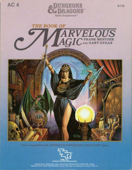 Item Code:9116 (AC4) Title: The Book of Marvelous Magic Type: Accessory Author: Frank Mentzer and Gary Gygax Published: 1984 Format: 76-page perfect-bound book |
