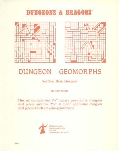 Item Code: #9004 Title: Dungeon Geomorphs Set One: Basic Dungeon Type: Accessory Author: Gary Gygax Published: 3rd print - 1978 Format: 6 loose cardstock pages |
