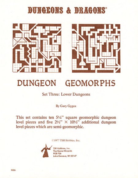 Item Code: #9006 Title: Dungeon Geomorphs Set Three: Lower Dungeons Type: Accessory Author: Gary Gygax Published: 3rd print - 1977 Format: 6 loose cardstock pages |