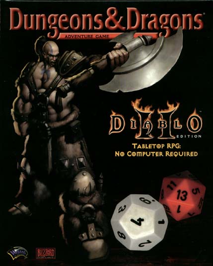 WITH THE WORLD'S GREATEST ADVENTURE GAME! Enter a world where evil has corrupted the land and shackled humanity into unholy slavery. Enter a world where you contend with the forces of ultimate evil. The DUNGEONS & DRAGONS game takes DIABLO II iinto a new dimension - a live dimension. You control the action. You control the dungeons that change with every adventure, holding deadly perils and great treasure! You take the role of Necromancer, Barbarian, Sorceress, Amazon, or Paladin to wage war with the unholy hordes of Evil. You become the Dungeon Master, bringing the adventure to life! INCLUDES EVERYTHING YOU NEED TO PLAY The DIABLO II Adventure Game includes: Two Books a DM Screen Twelve Sheets of Dungeon-Buildiing Tiles Five Hero Folders (right out of the computer game) and Six Dice. There's no limit to the mysteries and magic with the DUNGEONS & DRAGONS Adventure Game. And there's no room for the weak of heart in the world of DIABLO II. |