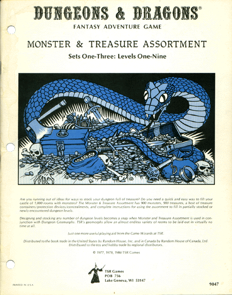Item Code: #9047 Title: Monster & Treasure Assortment Sets One - Three: Levels One - Nine Type: Accessory Published: 1980 Format: 32-page three-hole punched book |