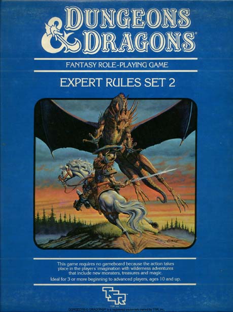 This box contains all you need to continue the Adventure: Endless hours of adventures. The D&D Expert Set for character levels 4-14, including more combat rules, magic spells, treasures, monsters and added rules for Wilderness adventures. Module X1, Isle of Dread. A combined wilderness and dungeon adventure on a remote island filled with savages and prehistoric monsters! All the dice you need - six different kinds included with marker crayon. TRY THE DUNGEONS & DRAGONS COMPANION SET Continue the Adventure with the D&D COMPANION SET - with more advanced rules, more treasures, more monsters - and MORE FUN! |