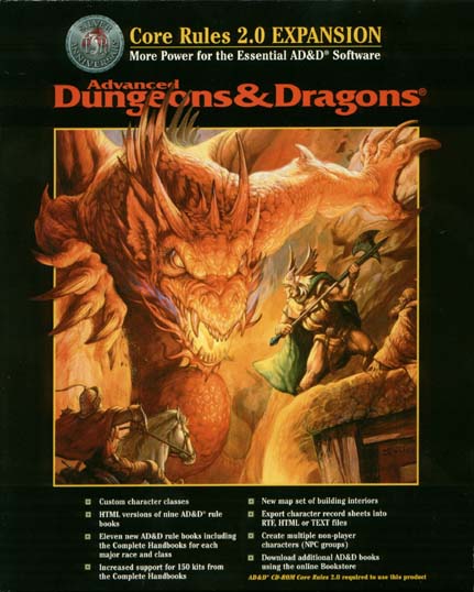 Even More Features for the Essential Software for AD&D Players and Dungeon Masters Create characters with custom classes, including specialty priests Key features of 150 custom character kits, as appear in the Complete Handbook series All nine key AD&D rulebooks included in HTML - over 2,000 pages now hypertext-linked and accessible by Windows 95, Windows 98, Macintosh systems Eleven new Complete Handbooks added: Bards, Druids, Fighters, Paladins, Priests, Thieves, Wizards, Rangers, Elves, Dwarves, and Gnomes & Halflings Additional map set featuring building interiors, for the Map Maker II program Customize character record sheets by converting to Rich Text Format files Create multiple non-player characters (NPC groups) AD&D Core Rules 2.0 CD-ROM required to use this product |