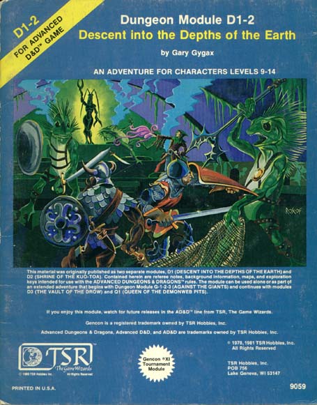 | Comments: This material was originally published as two seperate modules, D1 (DESCENT INTO THE DEPTHS OF THE EARTH) and D2 (SHRINE OF THE KUO-TOA). Contained herein are referee notes, background information, maps, and exploration keys intended for use with the ADVANCED DUNGEONS & DRAGONS rules. The module can be used alone or as a part of an extended adventure that begins with Dungeon Module G-1-2-3 (AGAINST THE GIANTS) and continues with modules D3 (THE VAULT OF THE DROW) and Q1 (QUEEN OF THE DEMONWEB PITS). |