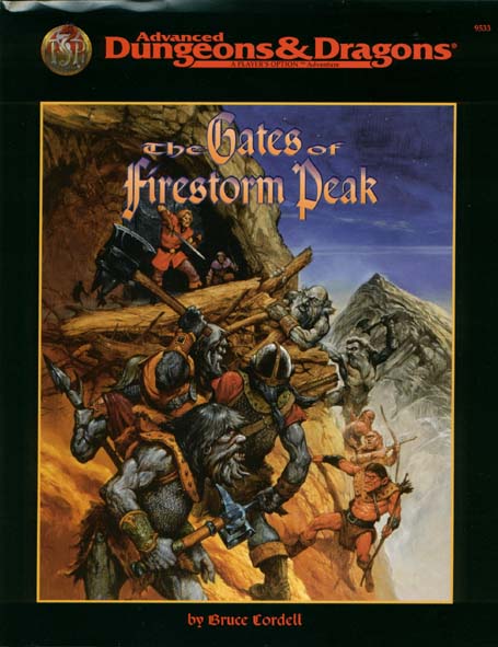 Item Code: #9533 Title: The Gates of Firestorm Peak Type: Adventure Author: Bruce Cordell Published: 1996 Format: folder, 96-page book, 4 full-color fold-out maps, cardstock counter sheet, ziploc bag |
