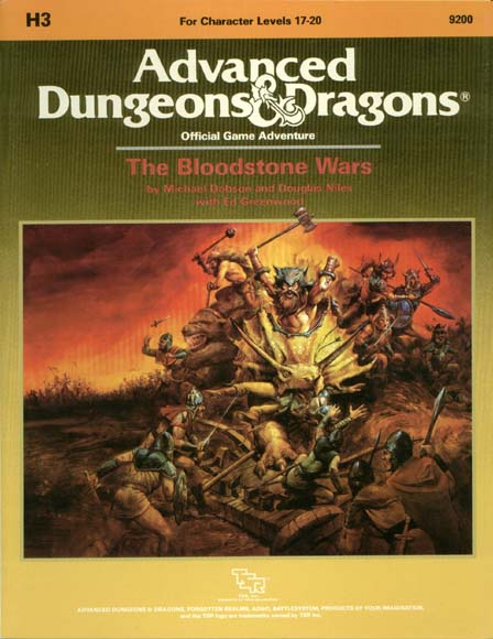 Item Code: #9200 (H3) Title: The Bloodstone Wars Type: Adventure Author: Michael Dobson and Douglas Niles with Ed Greenwood Published: 1987 Format: 32-page book w/tri-fold cover, fold-out map |