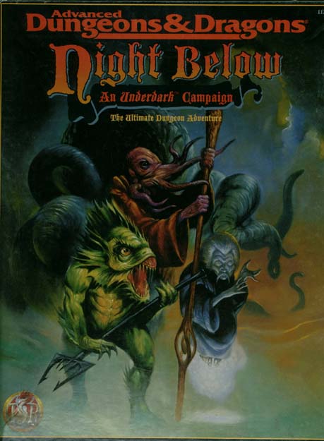 Item Code: #1125 Title: Night Below: An Underdark Campaign Type: Accessory Author: Carl Sargent Published: 1995 Format: 3 64-page books, 8-page book, 3 fold-out maps, 8 cardstock reference cards, 16 loose pages of player handouts |