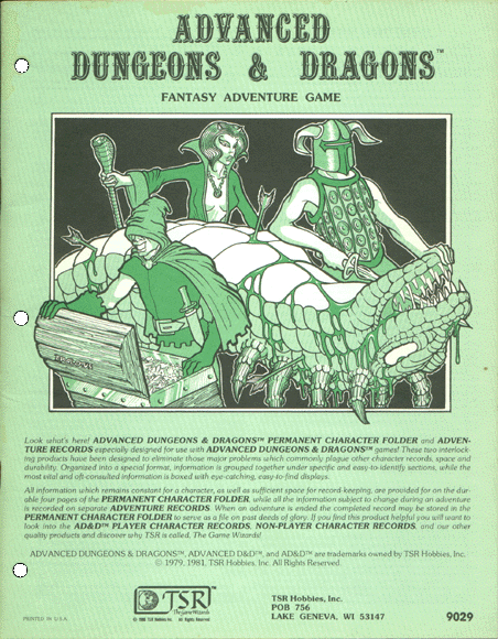 Item Code: #9029 Title: Permanent Character Folder and Adventure Records Type: Accessory Published: 1981 Format: 36-page book |