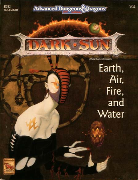 followers, and carry edged weapons. Earth, Air, Fire, and Water answers all your questions about this singular class of clerics. Here are the elemental priests who serve the elementals and Athas. They strive to return their barren and battered world to its former state of lush green valleys, forested mountains, and cool waterfalls. Here are the paraelemental priests who oppose the restoration of Athas, serving the paraelements whose power and might is growing as defiler magic continues to plunge Athas further into decay and ruin. New priest kits allow PCs to become an Athasian elemental priest of Earth, of Air, of Fire, or of Water - but they can only serve one, for the elements are jealous masters. Each kit contains unique powers, limitations, and proficiencies. Each offers four different ways in which to bring about the regeneration of Athas: as a Wanderer, as a Guardian of a shrine, as a City Cleric, or as a Shaman of a tribe. But beware the paraelemental priests - their success depends upon the failure of the elemental clerics! |