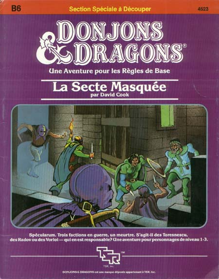Item Code: #4523 (B6) Title: La Secte Masquée Type: Adventure Author: David Cook Published: 1986 Format: 32-page book (16 pages text, 16 pages fold-up buildings, 10 total), tri-fold cover (1 panel fold-up characters, 12 total) |