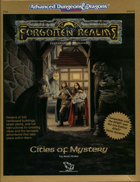 Item Code: #9262 (FR8) Title: Cities of Mystery Type: Accessory Author: Jean Rabe Published: 1989 Format: 64-page book, 33 cardstock fold-up buildings, 2 fold-out maps |