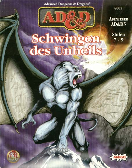 Item Code: #8005 (AD&D5) Title: Schwingen des Unheils Type: Adventure Author: Jim Bambra, Phil Gallagher and Graeme Morris Published: 1998 Format: 64-page perfect-bound book, single-page full-color map |