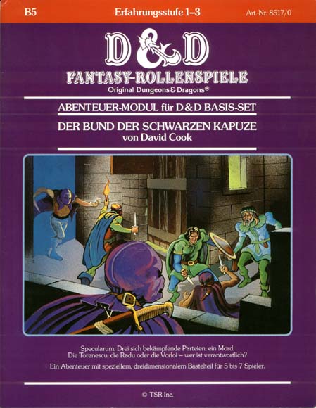 Item Code: #8517/0 (B5) Title: Der Bund der Schwarzen Kapuze Type: Adventure Author: David Cook Published: 1984 Format: 32-page book w/tri-fold cover |