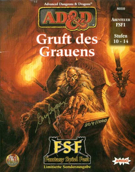 Item Code: #8010 (FSF1) Title: Gruft des Grauens Type: Adventure For: 4-10 characters, levels 10-14 Author: Gary Gygax Published: 1999 Format: 56-page book, signed and numbered by Gary Gygax |