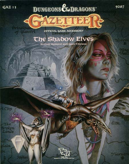 the lands under the sun. The Shadow Elves is the thirteenth in the best-selling Gazetteer collection. It provides an in-depth look at the culture, history, and goals of the Shadow Elves in the DUNGEONS & DRAGONS game world, including: a 32-page Player's Guide, providing instructions on the creation and role-play of Shadow Elf player characters, their cultural backgroun and skills. a 64-page DM's Guide with a complete atlas of the Shadow Elves' lands, new rules for shamans and their dark mystical powers, and a complete set of adventures. a large color map-sheet depicting this great new world, and the fabulous City of the Stars. |