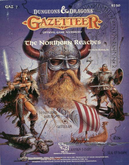 Item Code: #9230 (GAZ7) Title: The Northern Reaches Type: Accessory Author: Ken Rolston Published: 1988 Format: 64-page book, 32-page book, cover, fold-out map, 8 pages cardstock fold-up buildings |